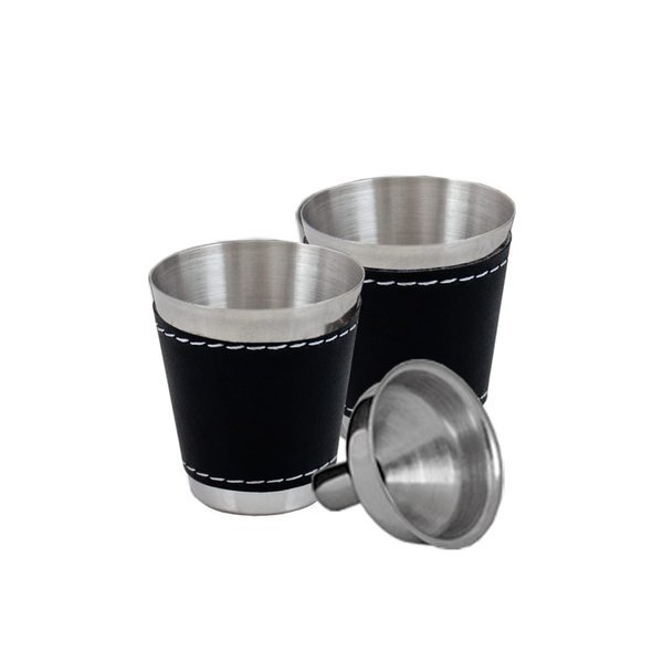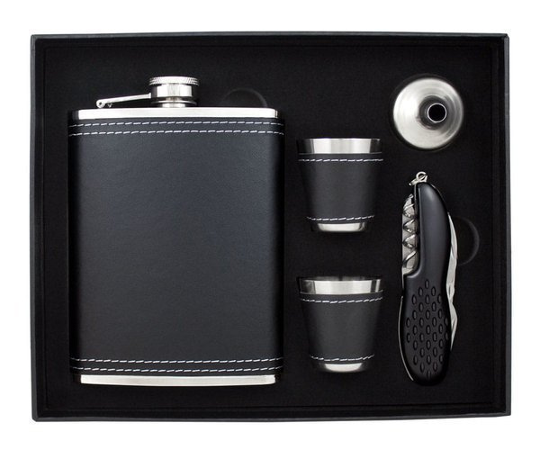 Pięcioczęściowy zestaw zawierający piersiówkę, o pojemności 240 ml, wykonaną ze stali szlachetnej, dwa kieliszki, lejek oraz wielofunkcyjny scyzoryk. Piersiówka i kieliszki oprawione w czarną eko-skórę. Zestaw zapakowany w ozdobne pudełko.