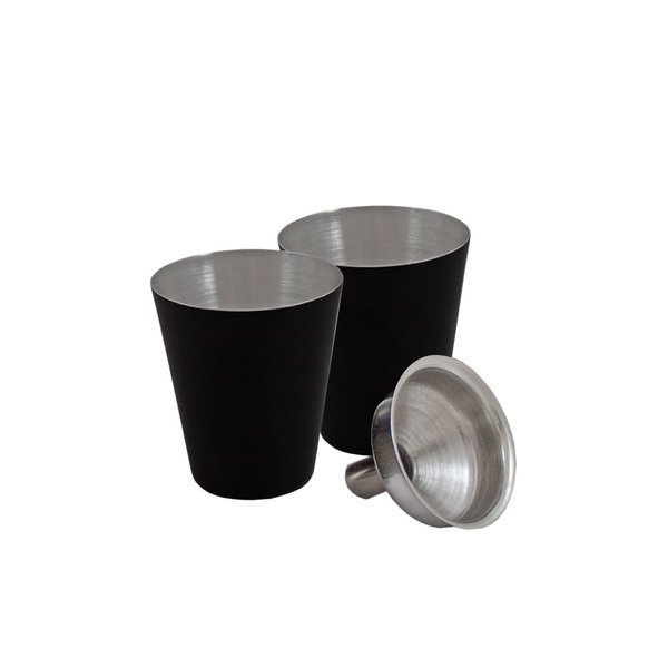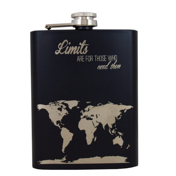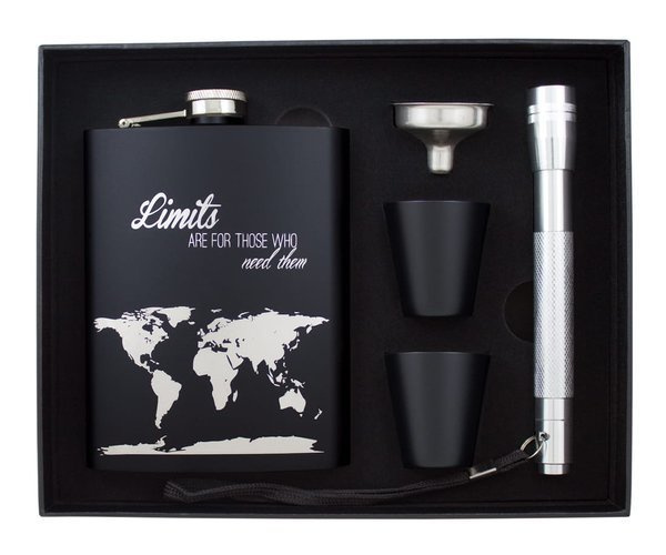 Pięcioczęściowy zestaw zawierający piersiówkę, pojemności 240 ml, wykonaną ze stali szlachetnej, oksydowaną z mapą świata, 2 kieliszki, lejek oraz latarkę. Zestaw zapakowany w ozdobne pudełko