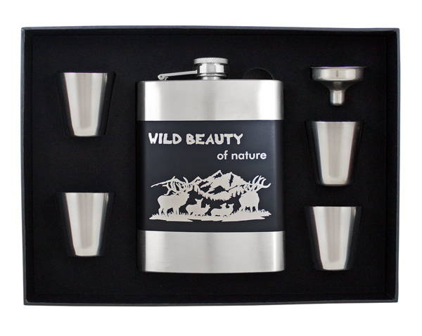 Pięcioczęściowy zestaw zawierający piersiówkę, o pojemności 240 ml, wykonaną ze stali szlachetnej, cztery kieliszki oraz lejek. Piersiówka oksydowana w motyw jeleni na rykowisku. Zestaw zapakowany w ozdobne pudełko z tasiemką.