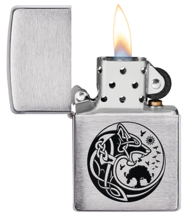 Zapalniczka Zippo 60005720 (Viking Design) to oryginalna, benzynowa zapalniczka Zippo z motywem wikingów, osadzona na eleganckiej bazie Brushed Chrome. Grafika nawiązuje do kultury wikingów — przedstawia stylizowany statek, drzewo, ptaki i nordyckie symbole.